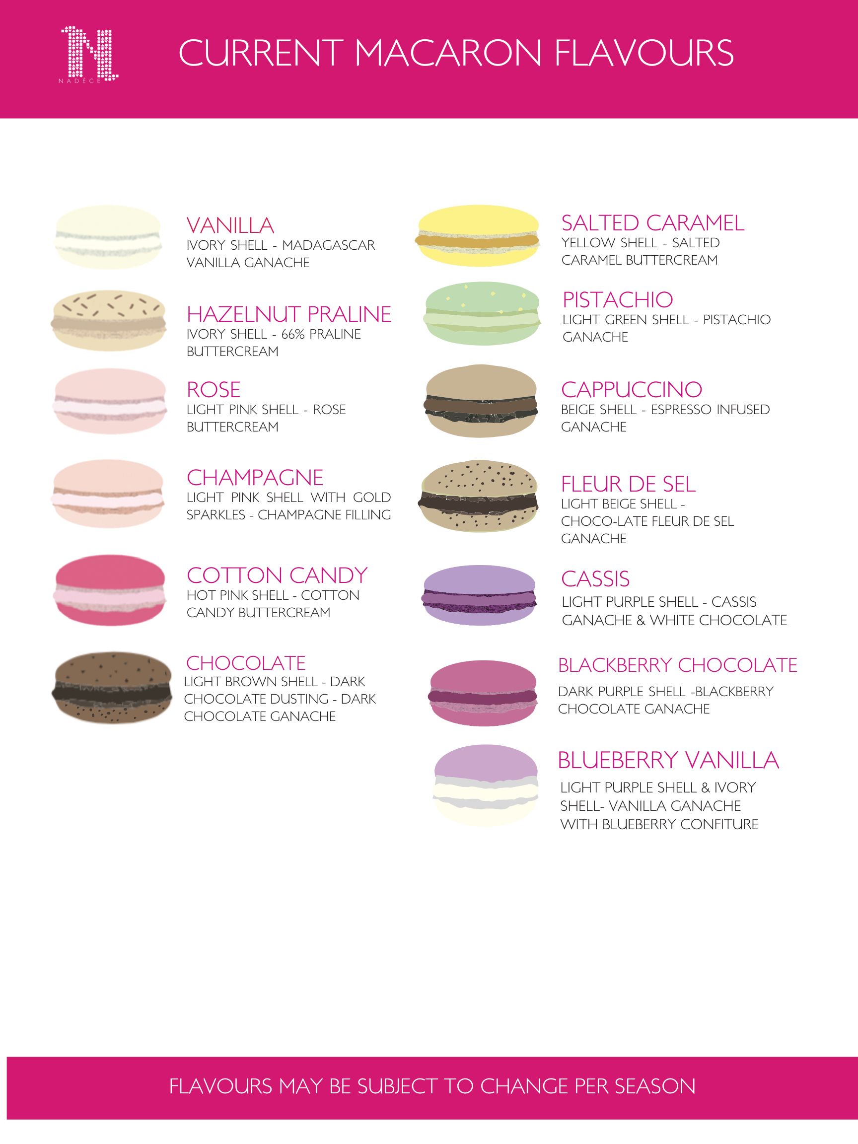 The macarons are recommended to stay in the fridge and will keep for 4 days in your refrigerator. We recommend taking them out 30 mins before consuming them. Contain nuts, dairy, eggs, soy.
